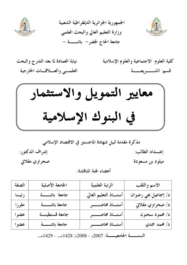 معايير التمويل و الإستثمار في البنوك الإسلامية